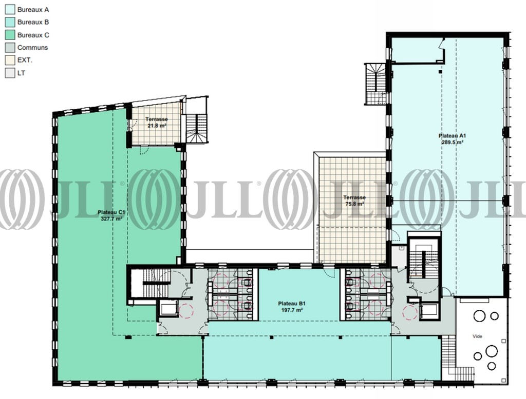 Bureaux lumineux et modulables à partir de 250 m², RDC ERP5 avec terrasses privatives à chaque étage.