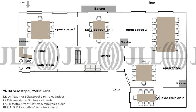 Au cœur du prestigieux 3ème arrondissement de Paris, ce bureau privatif d'exception de 130m² vous attend au 76 Boulevard Sébastopol, dans un emplacement stratégique du Marais historique. Idéalement configuré pour accueillir 26 postes de travail, cet espace professionnel allie élégance architecturale et aménagement contemporain dans un environnement baigné de lumière naturelle. Sa localisation privilégiée offre un accès direct aux stations de métro Réaumur-Sébastopol et Arts et Métiers, assurant une connectivité optimale avec l'ensemble du réseau parisien. Exposé sud-ouest, le bureau bénéficie d'un ensoleillement optimal tout au long de la journée et propose des services premium incluant des salles de réunions parfaitement équipées et des phone booths insonorisés pour garantir confidentialité et concentration. Situé dans le dynamique quartier des Arts et Métiers, à la frontière du Marais et de Beaubourg, ce bureau bénéficie d'un environnement culturel et commercial exceptionnel. À proximité immédiate du Centre Pompidou, des boutiques de créateurs et des nombreux restaurants qui font la renommée du quartier, il offre un cadre de travail inspirant dans l'un des secteurs les plus prisés de la capitale. Cette adresse de prestige combine harmonieusement l'effervescence urbaine et le charme du Paris historique, répondant parfaitement aux attentes des entreprises recherchant un cadre à la fois élégant et stimulant dans un arrondissement synonyme d'innovation et de patrimoine.