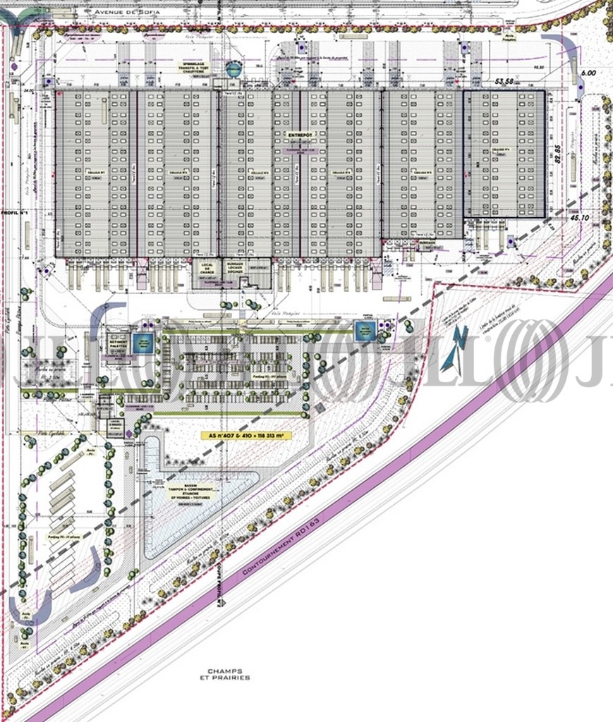 Le bâtiment total est composé de 6 cellules d’environ 5700 m² à 4000 m² ( inclus une cellule de stockage de liquides inflammables de 1200 m²).